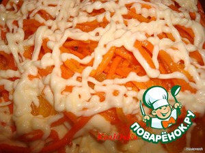Снова слой морковки и сеточку майонеза, можно и сырка немножко, но я захотела немного облегчить его.