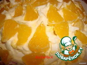 Берем апельсин, разделываем на дольки и режем дольки на кусочки, затем как будто вставляем в салатик плотненько + сеточка