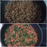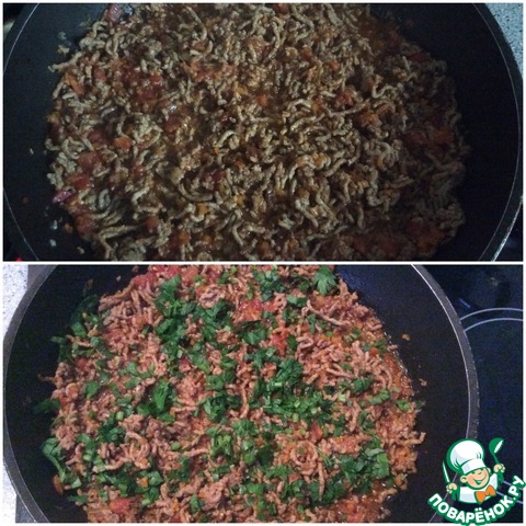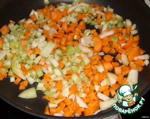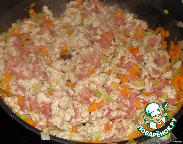 Затем добавим фарш... и жарим с морковью луком и сельдерем. до тех пор пока фарш не изменит цвет (посветлеет)Посолите... поперчите...
