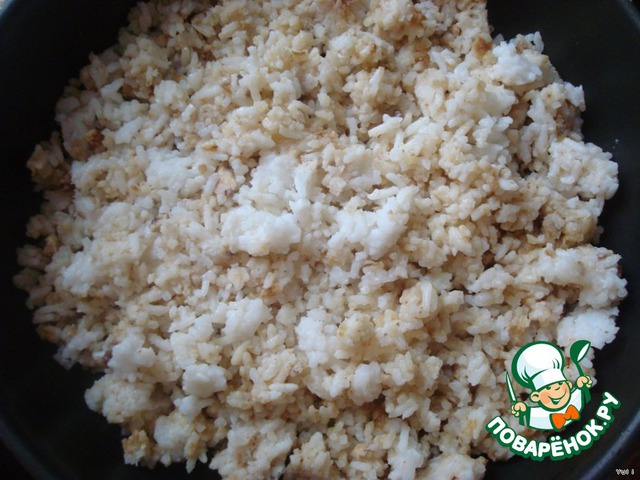 Отварной рис положить на дно формы для запекания. У меня остался рис от гарнира: рис+грецкий орех, поджаренный на сливочном масле http://www.povarenok .ru/recipes/show/189 43/