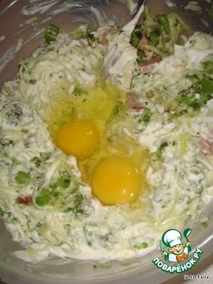 Добавляем мягкий сыр, яйца и муку. Вымешиваем.