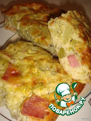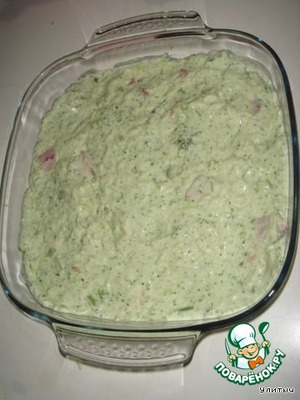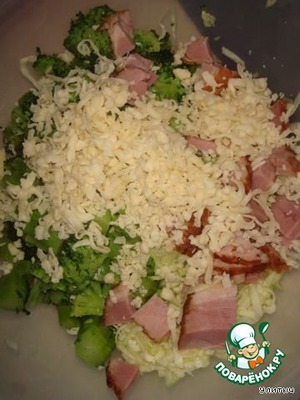 К кабачку отправляем нарезанную брокколи, тертый сыр и ветчину.