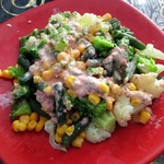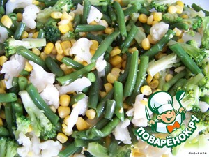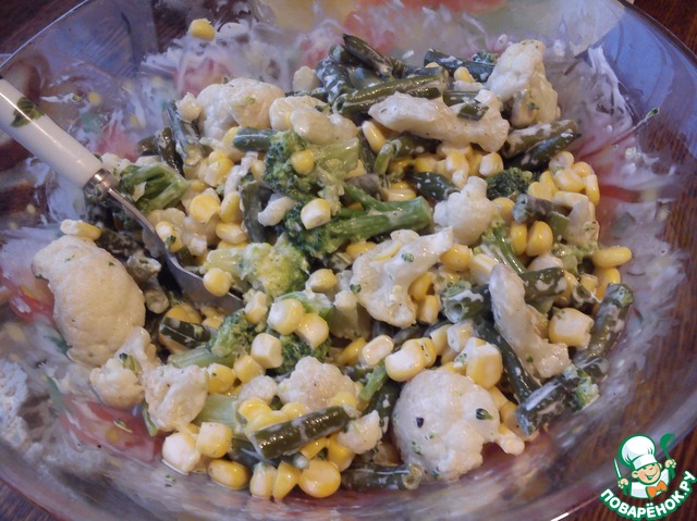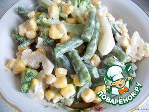 Капусту разделываем на мелкие соцветия, добавляем фасоль и кукурузу.