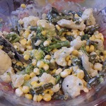 Овощи аккуратно перемешиваем с кукурузой и заправляем перцем и майонезом.
