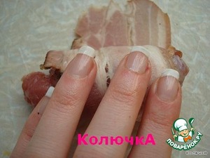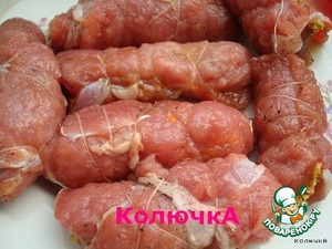 и начинаем закручивать рулетики с сырно-овощной начинкой.Я еще перевязывала их ниточкой что бы лучше держались