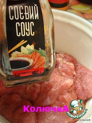 складываем мяско солим перчим добавляем соевый соус и даем промариноваться немного