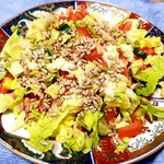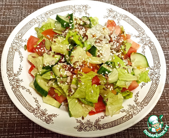 Нарезать листья салата, огурец, помидор и добавить жареных семян семечек.