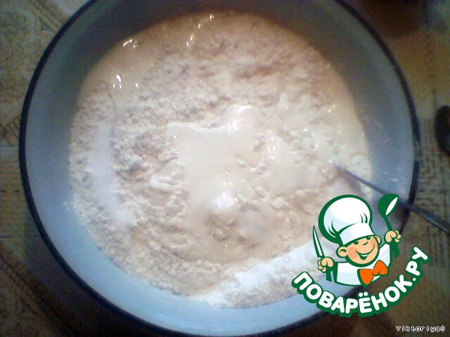 Добавляю все ингредиенты в муку и замешиваю тесто.