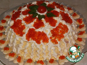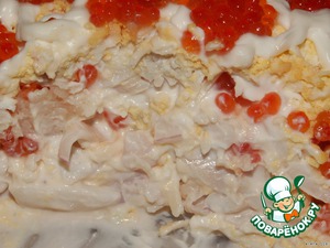 Первый слой - первая часть кальмаров, сбрызнуть майонезом, посыпать икрой.
