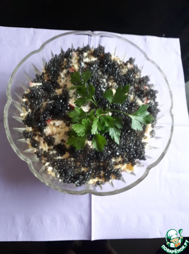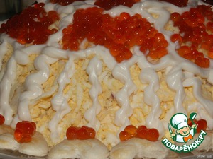 Далее - слой сыра, сбрызнуть майонезом, посыпать икрой.