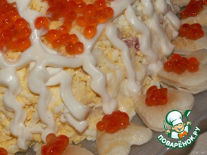 Для украшения из слоeного теста сделать фигурки (у меня сердечки), испечь при 200 градусах до готовности, сверху на остывшие изделия положить немного икры.