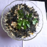 Следующий слой - картофель, сбрызнуть майонезом, посыпать икрой.