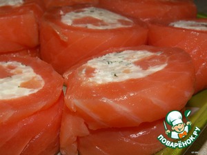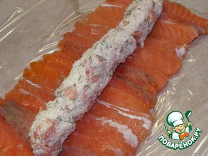 Начинку скатать колбаской, положить посередине на рыбу, с помощью плeнки скатать рулетом.