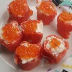 Ломтики рыбы положить внахлeст на пищевую плeнку (чтобы один кусочек заходил на половину на другой).