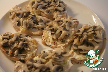 На майонез положить лук, грибы и поставить на 10-15 минут в предварительно разогретую духовку (180 -200 градусов).