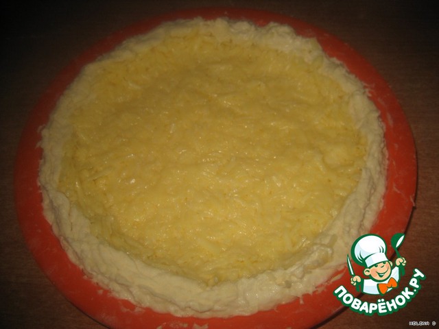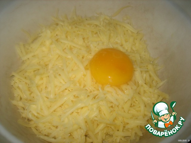 Начинка: в тёртый сыр добавляем яйцо и выкладываем на тесто..