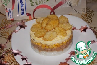 Каждый слой промазывать майнезом, так салат получается не таким сухим.