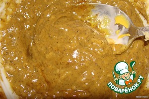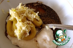 Смешиваем горчицу, соевый соус, хмели-сунели, майонез, мед и раздавленный чеснок