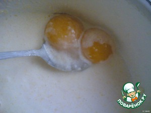 Когда смесь будет теплой, но не горячей, добавить яйца, хорошо размешать.