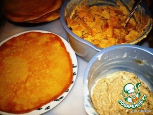 Раскатывать тонкие коржи (как на пельмени или вареники), сделать проколы вилкой (у двух коржей, которые будут использованы как основа. Остальные можно не протыкать).