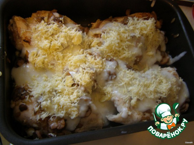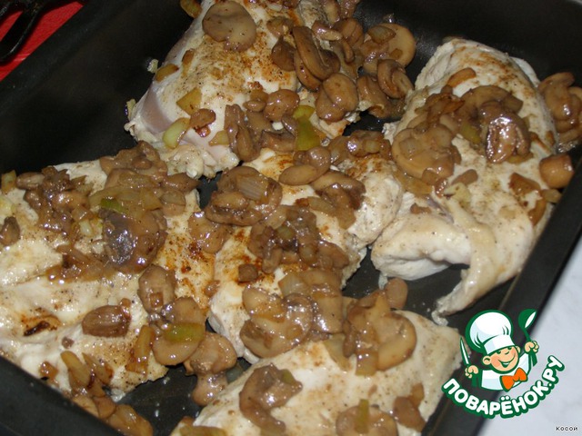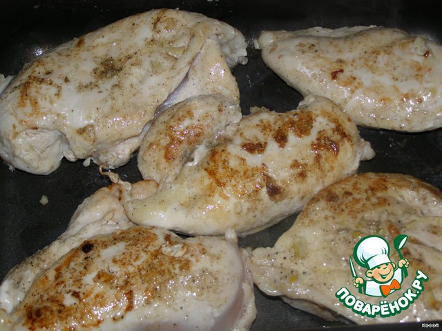 Слегка обжарить грудки с двух сторон на сливочном масле, до золотистой корочки и уложить в лоток или протвинь.