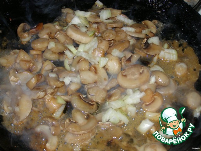 Приготовить соус (как для жульена)- пожарить на сливочном масле муку. Затем на эту сковороду в муку понемногу подливать подсоленный грибной бульон (или воду) со сметаной, одновременно быстро растирая комочки муки до однородной эластичной консистенции (жидкой сметаны).