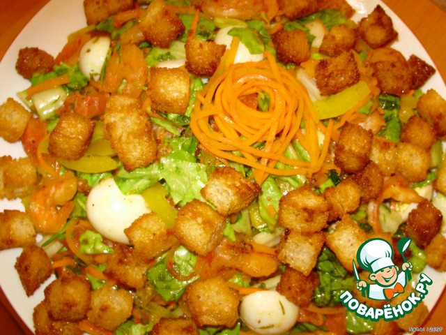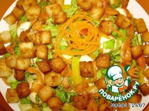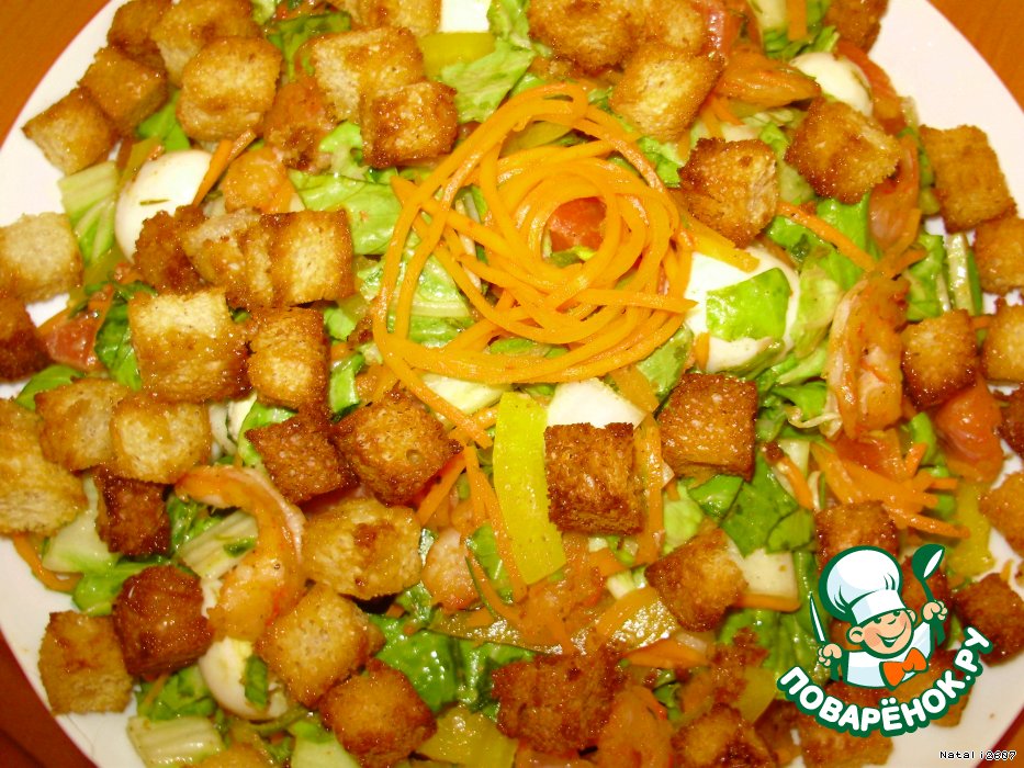 Все ингредиенты (кроме сухариков) смешать, заправить соусом. Выложить на блюдо и сверху посыпать сухариками.