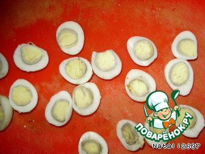 Перепелиное яйцо отварить, почистить и разрезать пополам.