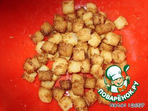 Хлеб нарезать кубиком 1x1 см. Подсушить в духовке до золотистого цвета.