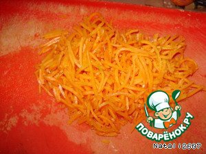 Болгарский перец почистить от семян и прожилок, нарезать соломкой.