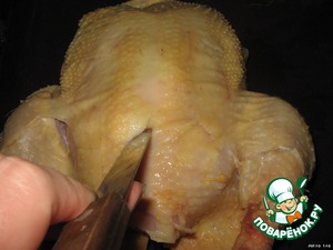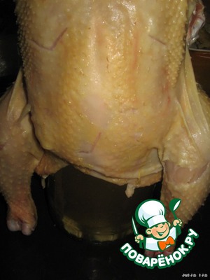 Курицу слегка посолить и поперчить внутри. Нашпиговать чесноком (5 зубчиков). Для этого чеснок очистить, разрезать вдоль пластинками и, делая длинным ножом глубокие проколы в курице, внедрить в неё чеснок. -