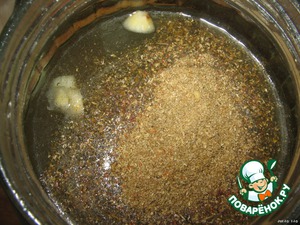 В обычную банку (700 гр) налить воды (лучше тёплой), положить два зубчика чеснока (я их просто нарезала) и любые специи. Мне захотелось хмели-сунели.