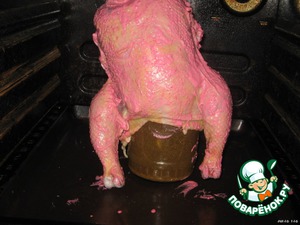 Курицу торжественно водрузить на банку (банку предварительно поставить на противень, а духовку разогреть до 200 градусов).