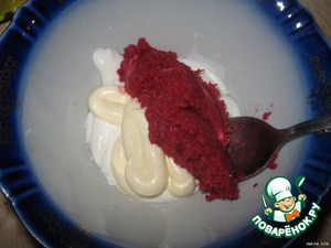 Смешать сметану, майонез и хрен со свеклой (у нас в баночках продаётся уже готовый, но можно в обычный хрен добавить свекольный сок).