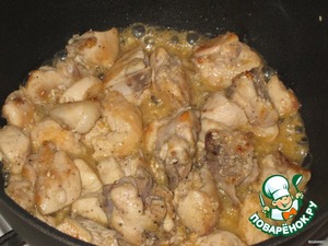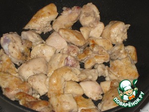 Выложить кусочки курицы и обжарить до румяной корочки на большом огне.