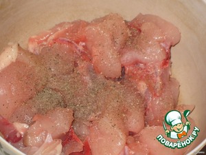 Куриную грудку, вместе с костями порезать на кусочки, посолить, поперчить, растереть горчицей. Оставить на 30-40 минут.