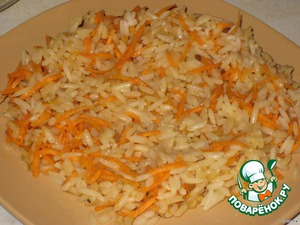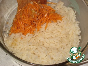 Как рис свариться, переложить в тарелку (можно и в кастрюле оставить, но мне она нужна была) добавить в него морковку со всем содержимым и перемешать. Дать полностью остыть.