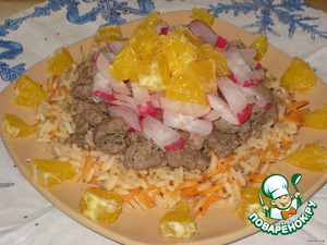 Продолжение нашего девичьего стола. Салатик очень порадовал не только глаз, но и само сердце желудка))) Маринованный рис с сырой морковкой, очень пикантно и вкусно уже, дальше еще вкуснее, добавляем нежную куриную печень, для хрустящей свежести добавим редиску, украсим все апельсинами для кисло-сладкой нотки, в итоге получим массу положительных эмоций. А если еще и компания подходящая, то можно наслаждаться и тем и другим бесконечно, не забыв конечно про бутылочку (другую) хорошего винца.