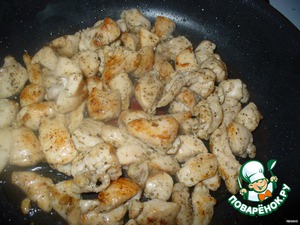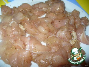 Куриное филе нужно нарезать на мелкие кусочки. Посолить, поперчить по вкусу, посыпать хмели-сунели.