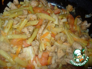 Затем, фасоль. Еще минуту жарим.