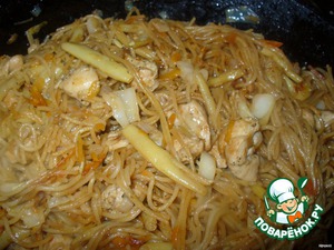 Добавить немного воды, соевый соус, перемешать. Тушить под крышкой на медленном огне до готовности спагетти. Получается примерно минут 10. Нужно часто перемешивать, чтобы спагетти не слиплись и не пригорели. По мере надобности добавлять немного воды. Но спагетти должны тушиться, а не плавать в воде, поэтому воды нужно мало, только, чтобы, спагетти не пригорели и не прилипли ко дну! Вот и всё! На самом деле, это быстро и несложно! Приятного аппетита!