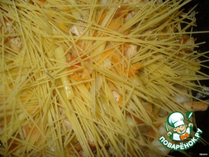 Затем добавляем сухие (не отварные!) спагетти. Это надо делать аккуратно. Я ломаю спагетти на 2 части и как-бы подсовываю их под овощи, и в середину, и сверху.