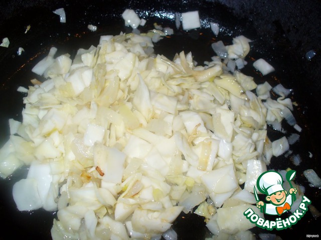 Как только лук станет прозрачным, добавить кубики капусты. Перемешивая жарить 1-2 минуты.