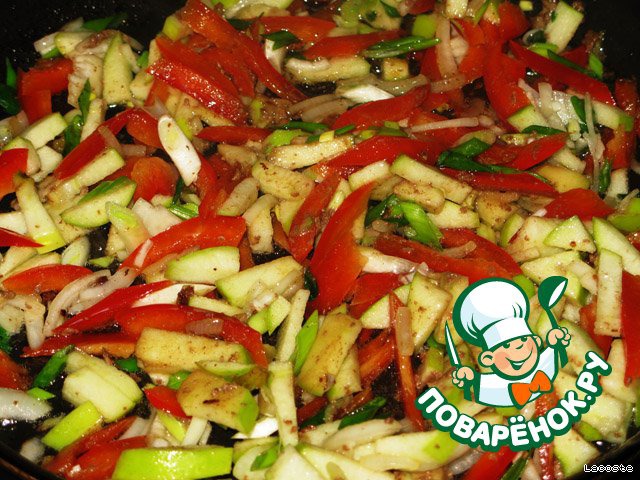В той же сковороде обжарить овощи: репчатый лук, перец и яблоко.