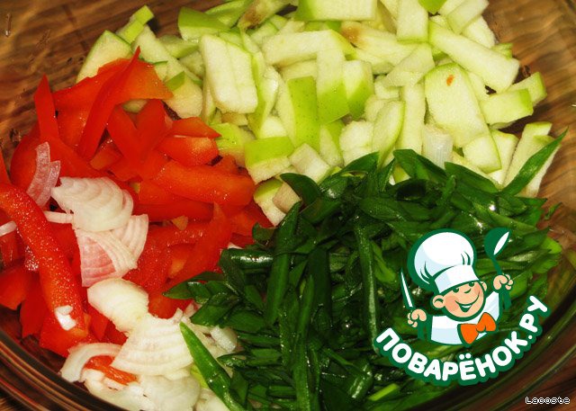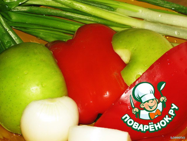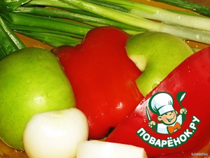 Репчатый лук нарезать полукольцами, перец - короткими полосками, яблоко - небольшими кусочками, зелёный лук - кольцами.