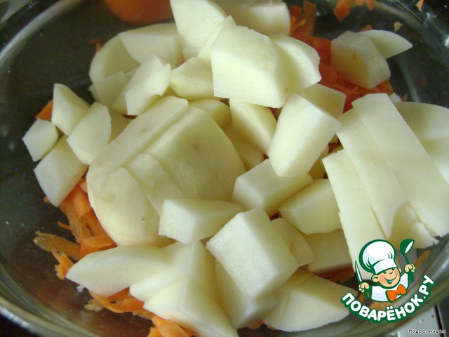 • Когда рыбка поджарится, переложить еe в блюдо для запекания, а на еe место овощи (картошку нарезать кубиками, морковь натереть на крупной тeрке, лук мелко нарезать).