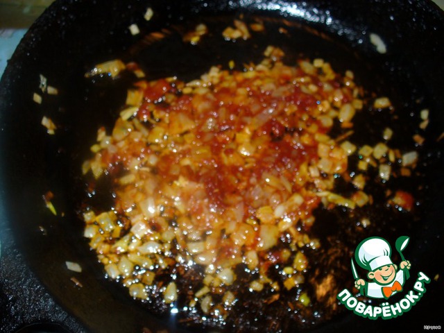 Лук мелко нарезать и обжарить вместе с пропущенным через пресс чесноком. Добавить томат-пасту, накрыть крышкой и потушить 5-7 минут.