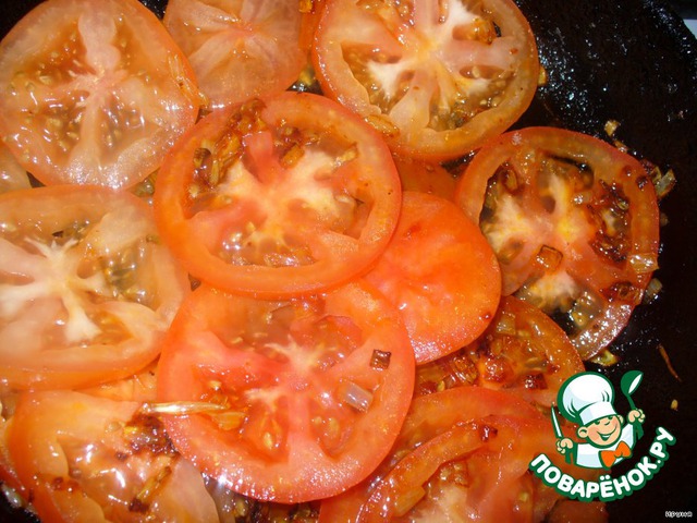 Помидоры нарезать кружочками. Если есть желание и время, перед нарезкой можно снять с них шкурку. (Перед этой операцией помидоры нужно обдать кипятком, потом сразу ополоснуть холодной водой).