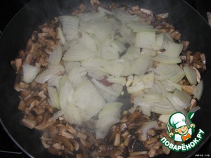 Шампиньоны нарезать кусочками. Обжарить в небольшом количестве растительного масла без запаха. -