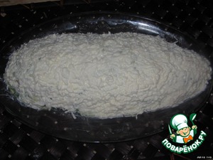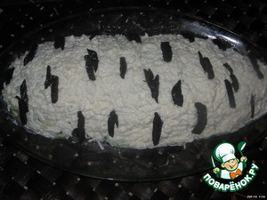 Выложить белки равномерным слоем так, чтобы салат со всех сторон был ими покрыт.